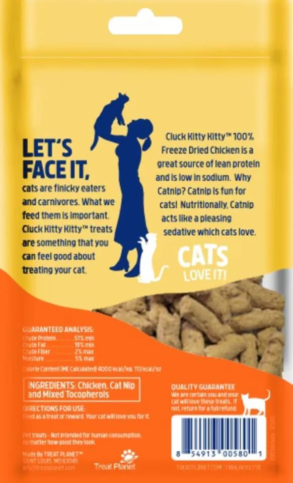 Let's face it, cats are finicky eaters and carnivores. What we feed them is important. Cluck Kitty Kitty treats are something that you can feel good about treating your cat. Cluck Kitty Kitty 100% Freeze-Dried Chicken is a great source of lean protein and is low in sodium. Why Catnip? Catnip is fun for cats! Nutritionally, Catnip acts like a pleasing sedative that cats love.