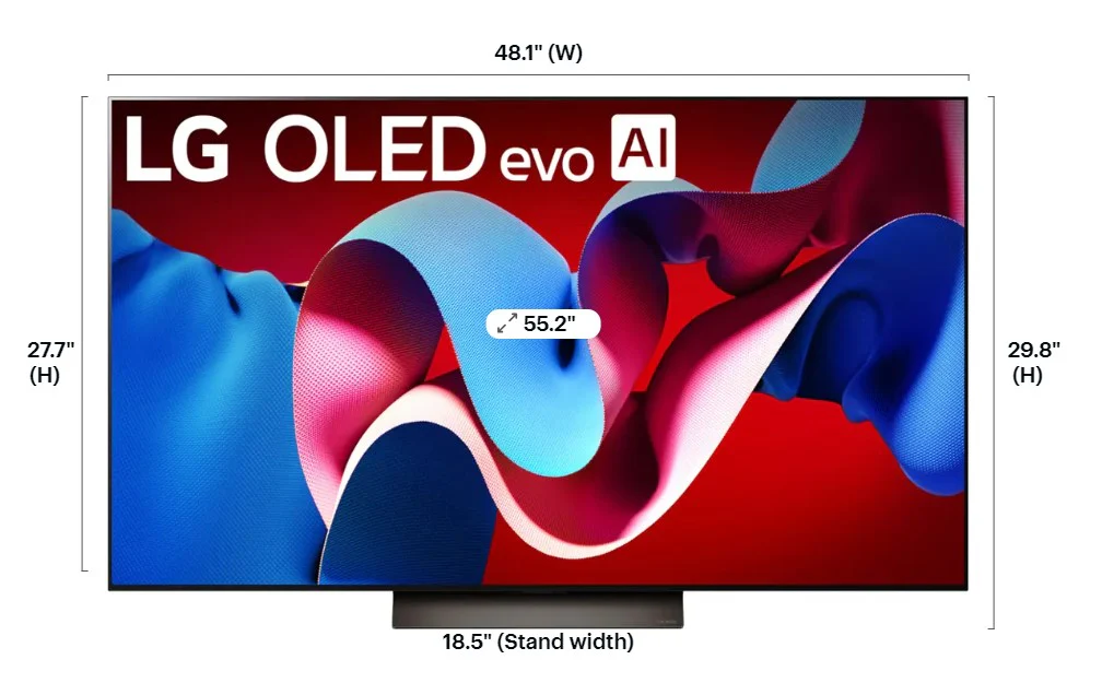 The advanced LG OLED evo C4-Series is better than ever. The LG OLED evo C4 is powered by the next-gen α9 Gen7 AI Processor exclusively made for LG OLEDfor ultra-realistic picture and sound along with boosted brightness for luminosity and high contrast, even in well-lit rooms. AI-assisted deep learning analyzes what you're watching to choose the best picture and sound setting for your content. The C4's almost invisible bezel, ensures it blends with your surroundings. When you're finished watching, display art, photos and other content make the C4 a versatile statement piece. Search less and stream more, thanks to the next generation of AI technology from LG webOS 24. Dolby Vision for extraordinary color, contrast and brightness, plus Dolby Atmos for sound you can feel all around you. And FILMMAKER MODE allows you to see films just as the director intended.