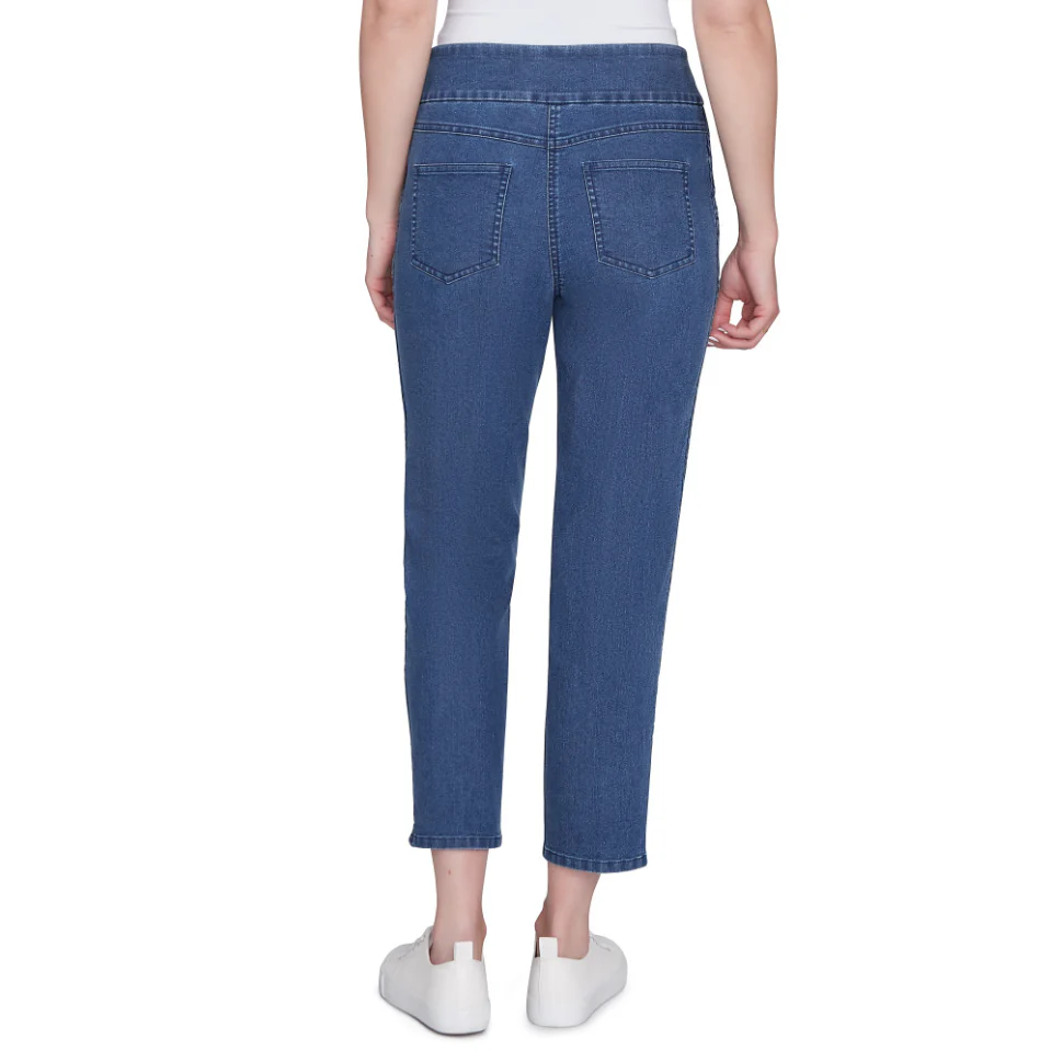 A side braid trim punctuates these lightweight stretch denim ankle pants detailed with pull-on ease.