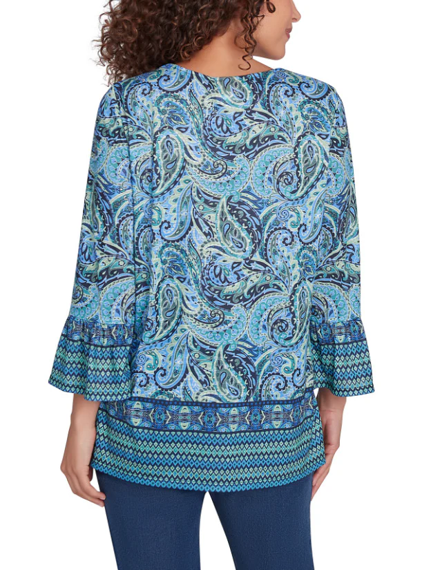 A stunning paisley print adorns this must-have bibbed top detailed with an embellished split neck and three-quarter-length flutter sleeves.