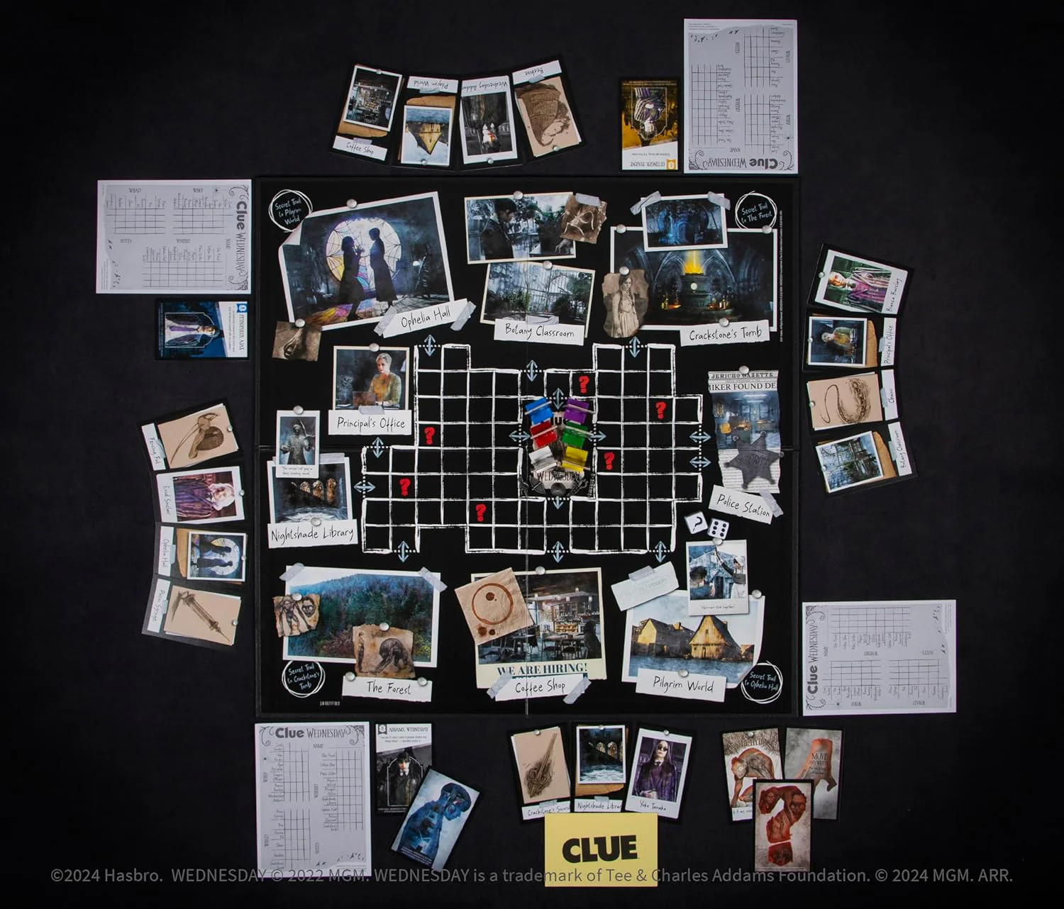 INSPIRED BY THE WEDNESDAY ADDAMS Netflix Series: - Uncover a dark and modern twist on the classic mystery game with CLUE: Wednesday. Navigate the eerie halls of Nevermore Academy and outsmart the dangerous Hyde before he strikes again!